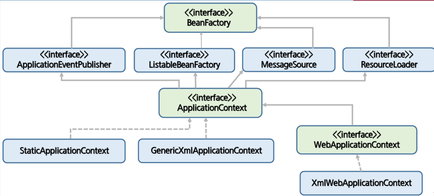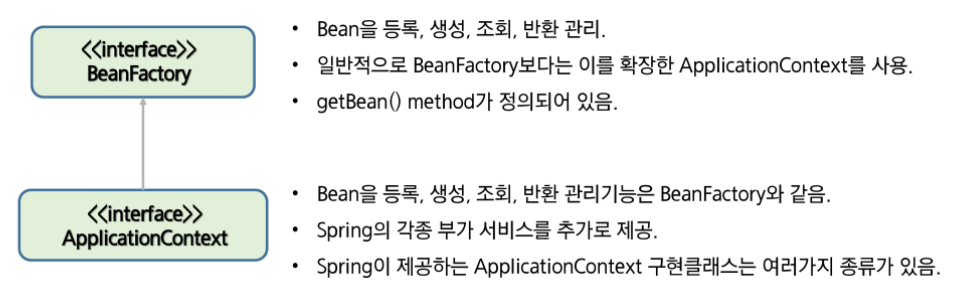 - BeanFactory를 바로 사용하지 않고 이를 확장한 ApplicationContext를 이용